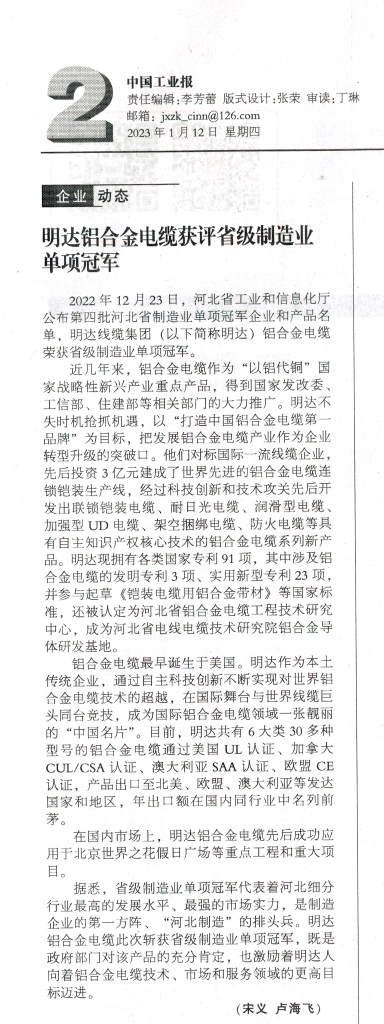 目的明确后,KAIYUN组织手艺职员一直举行研究及试制,终于乐成研制出铝合金电缆。之后,投资3亿元建成先进的铝合金电缆生产线,生产出拥有专利手艺的铝合金电缆新产品。